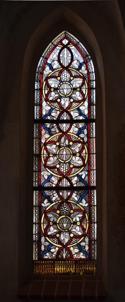 – witraż właściwy figuralny wykonany ze szkieł antycznych o wyrazistej fakturze oraz dużej ilości pęcherzy gazowych, barwionych w masie, o różnorodnej, bogatej kolorystyce, oraz warstwowych szkieł czerwonych, trawionych walorowo |