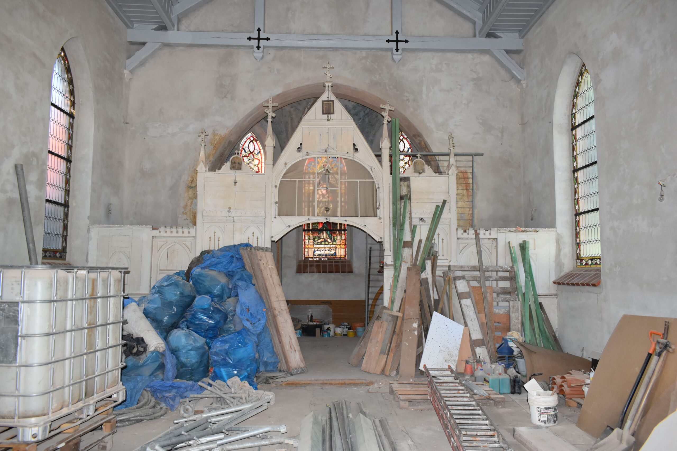 Witraże po co najmniej jednej konserwacji, nieodpowiednio zabezpieczone. W momencie inwentaryzacji kościół zastano w trakcie generalnego remontu. Okna częściowo zasłonięte, lecz niezabezpieczone, brak posadzek, z zewnątrz ustawione rusztowania. 768_e3ff74-db> |