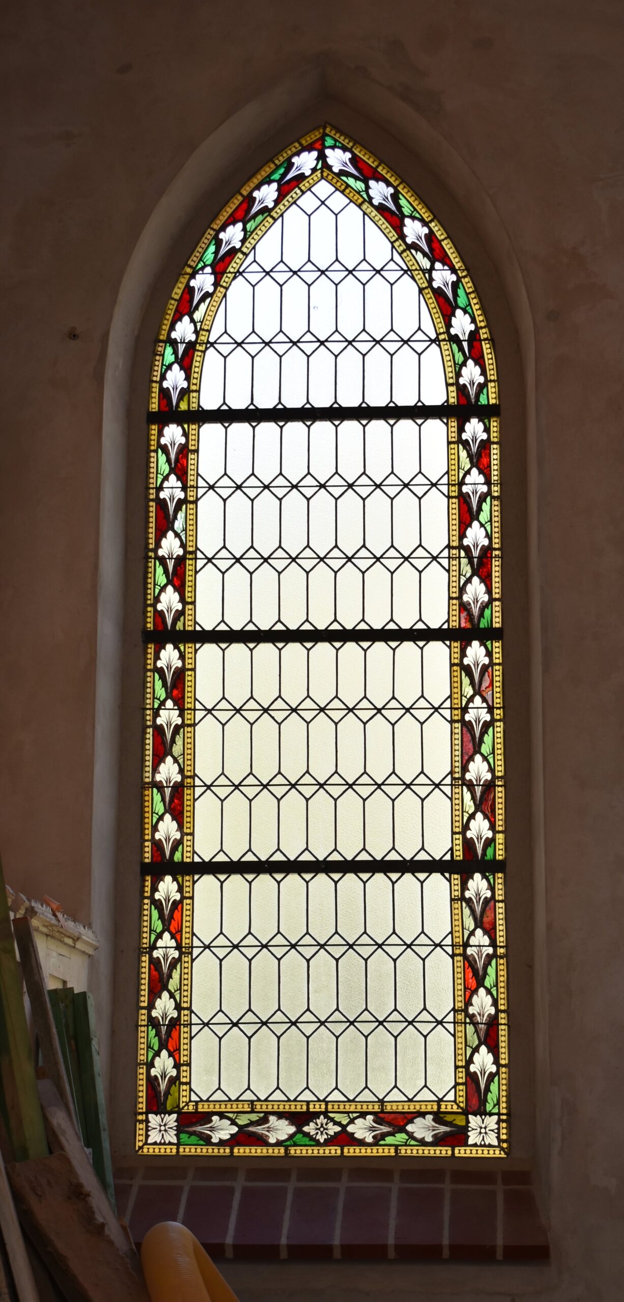 – witraż właściwy figuralny wykonany ze szkieł antycznych o wyrazistej fakturze oraz dużej ilości pęcherzy gazowych, barwionych w masie, o różnorodnej, bogatej kolorystyce, oraz warstwowych szkieł czerwonych, trawionych walorowo |