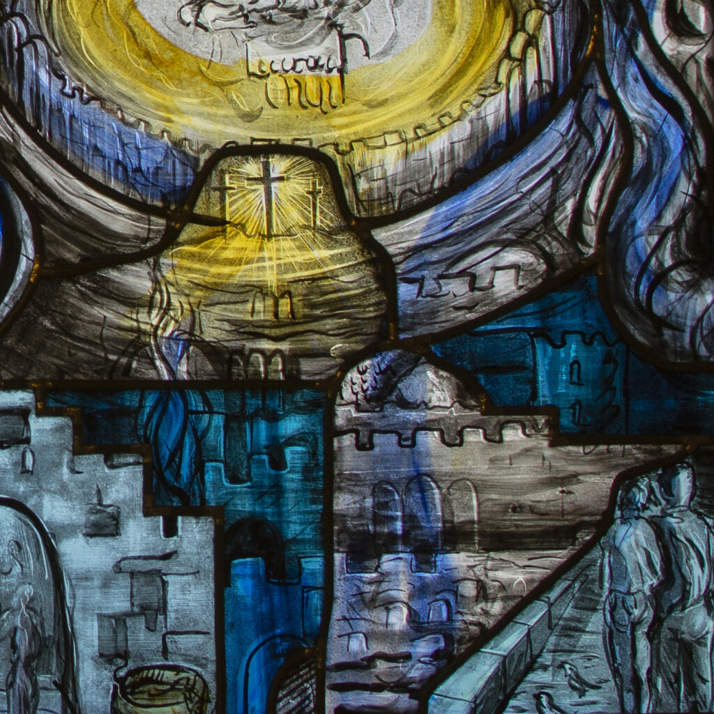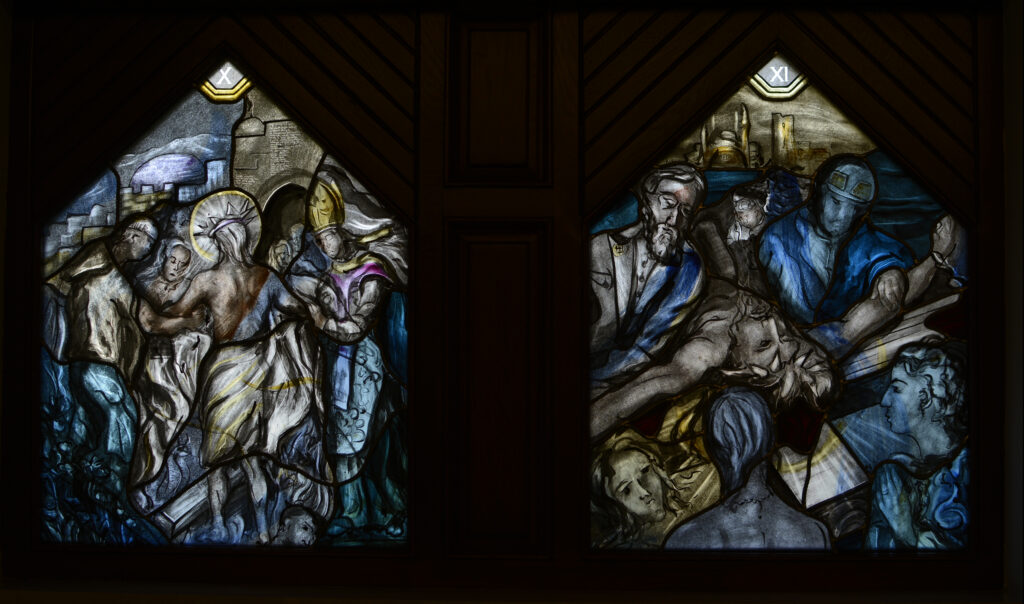 Okna nr 21, 22, 23, 24 – symboliczne przedstawienie czterech ewangelistów, kolejno św. Marek- lew ze skrzydłami, św. Jan- orzeł, św. Mateusz- półpostać, św. Łukasz- byk ze skrzydłami. Okna nr 10, 11, 12, 13– przedstawienie postaciowe aniołów adorujących krzyż. Sylwetki ukazane są frontalnie, ich głowy zwrócone są w kierunku ołtarza. Ręce złożone w modlitewnym geście. Okna nr 1, 2, 3, 4, 5, 6, 7, 8, 9, 14, 15, 16, 17, 18, 19, 20 – przedstawienia kolejnych 14 stacji Drogi Krzyżowej, uzupełnione przez 2 witraże dodatkowe z przedstawieniem miasta świętego – Jerozolimy. Każdy witraż skomponowany jest wg. tego samego schematu, w dolnej części rozgrywa się scena przypisana do konkretnej stacji Drogi Krzyżowej, najczęściej wielopostaciowa kompozycja skoncentrowana na osobie Chrystusa, osadzona na alegorycznym tle miasta lub pejzażu, zwieńczona u góry inskrypcją z numerem stacji pisanym rzymskimi cyframi. We wszystkich kompozycjach linie ołowiu tworzą kontur dla przedstawienia. Witraże są wielowarstwowo malowane. W wielu miejscach znajdują się inskrypcje, fragmenty poezji, często będące komentarzami do aktualnej sytuacji kościoła powszechnego i lokalnego oraz sytuacji politycznej. Można odnaleźć wątki z życia osobistego autora witraży. Kolorystyka konsekwentnie oszczędna – oscylująca w gamie błękitów i szarości, wzbogacona incydentalnie żółcią i czerwienią.