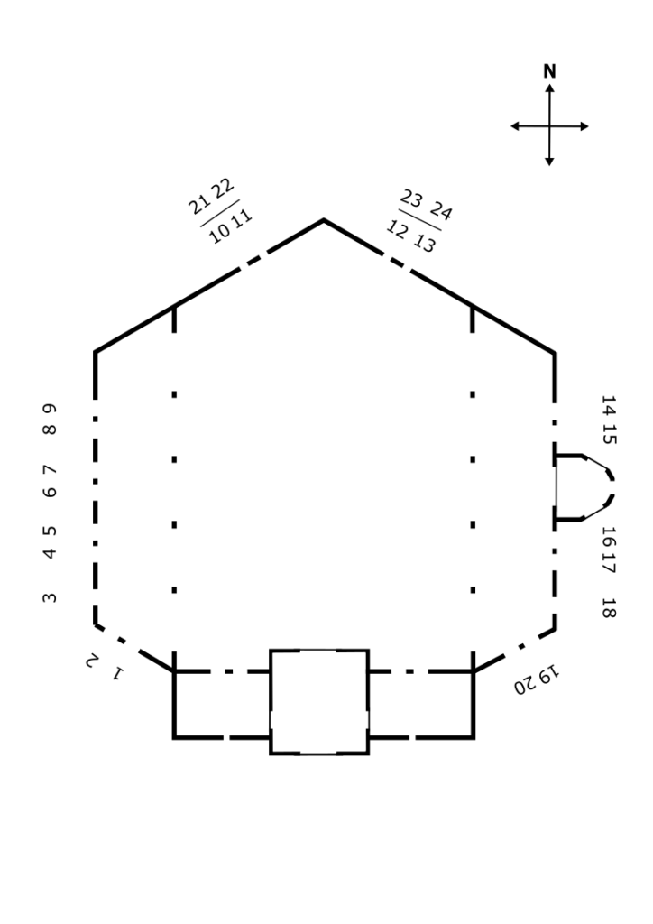 Nawa główna: okna o numerach: 1, 2, 3, 4, 5, 6, 7, 8, 9, 14, 15, 16, 17, 18, 19, 20 prostokąt zamknięty trójkątem równoramiennym Wysokość 77 cm. szerokość 57,5 cm