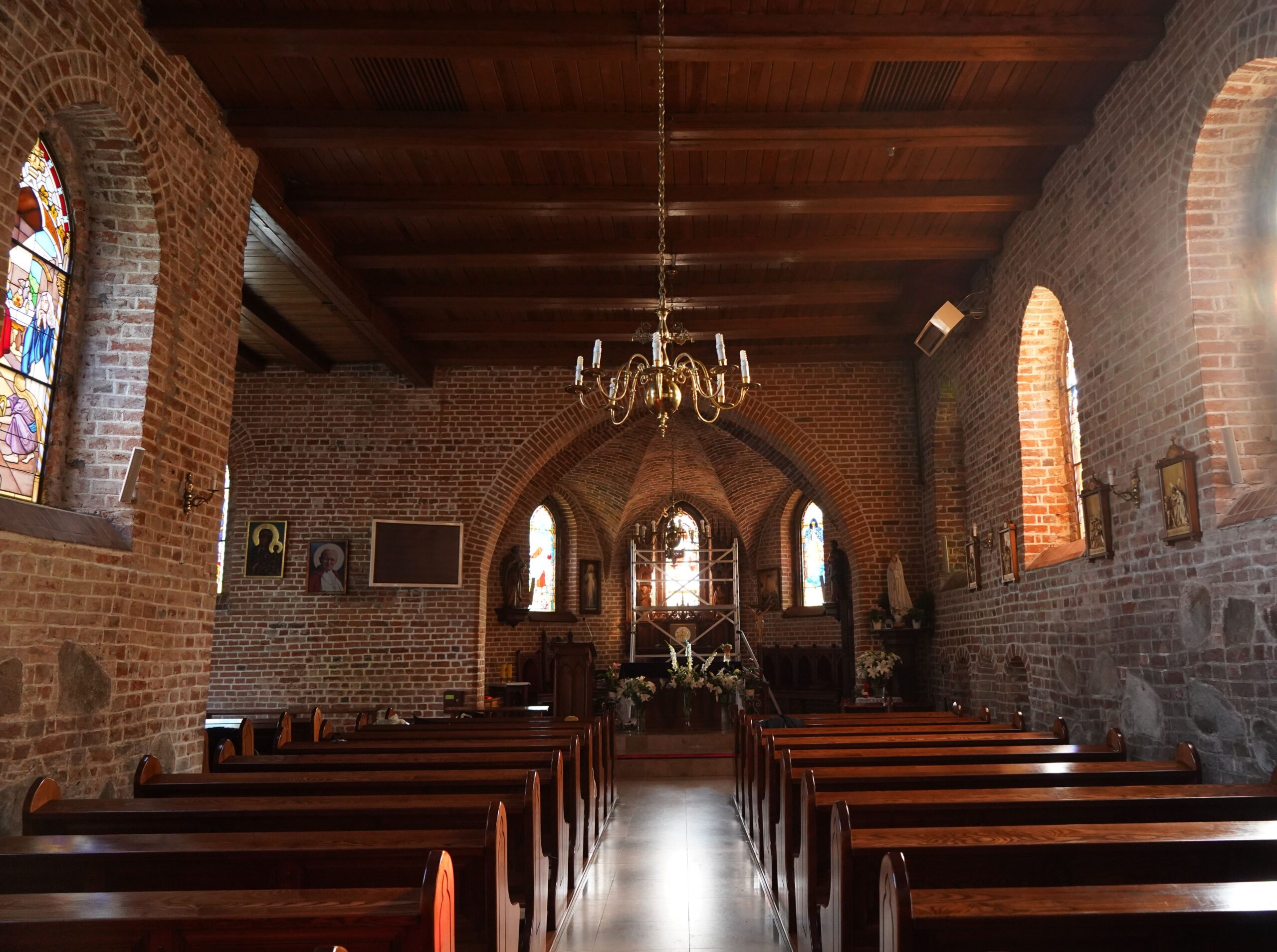 Budynek orientowany. Styl gotycki XV w. i neogotycki, budowla z cegły oraz głazów granitowych (kamienna podmurówka).