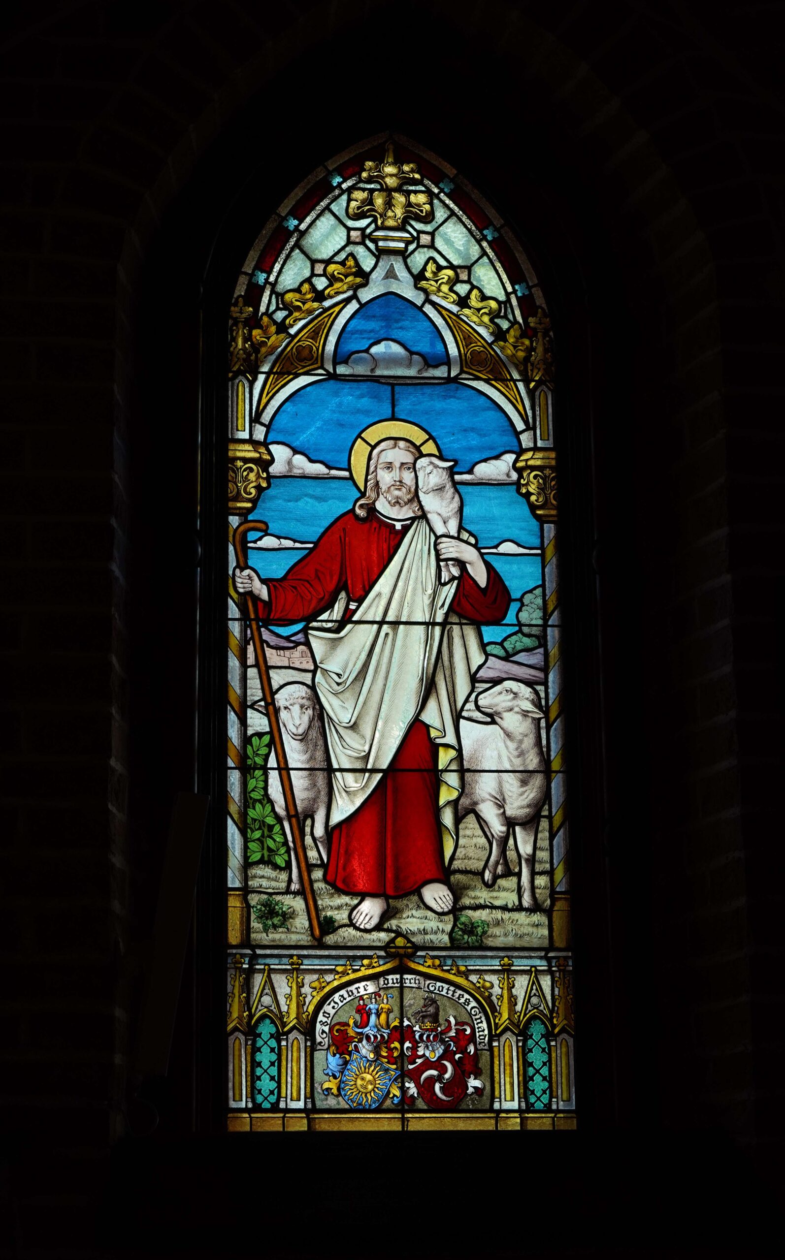 W centralnym oknie I. kompozycja figuralna Ostatnia Wieczerza, flankowana przez dwa witraże: nII Chrystus Dobry Pasterz oraz Boże Narodzenie sII. Przedwojenny witraż nII poza przedstawieniem postaci Chrystusa Dobrego Pasterza uzupełniony jest o przedstawienia heraldyczne w kwaterze a1.