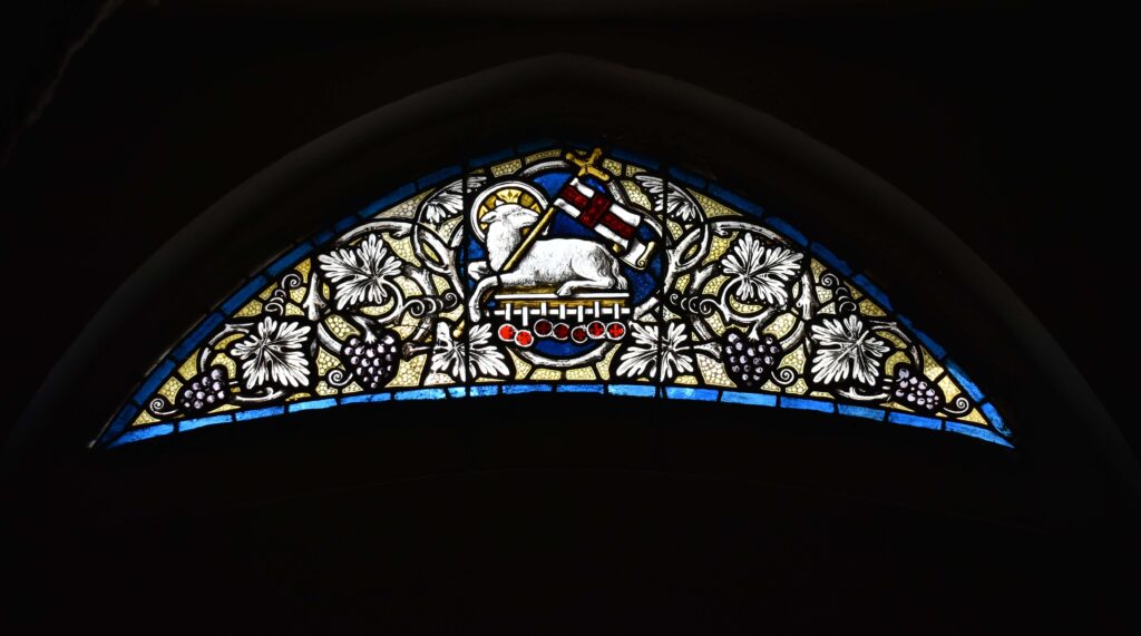 Witraż właściwy – numery 14, 15, 16 w prezbiterium oraz 1, 2, 3, 4 okna w nadświetlu oraz drzwiach wewnętrznych |