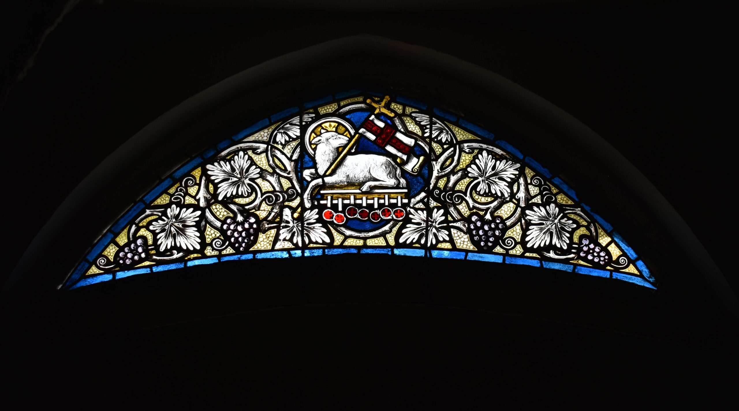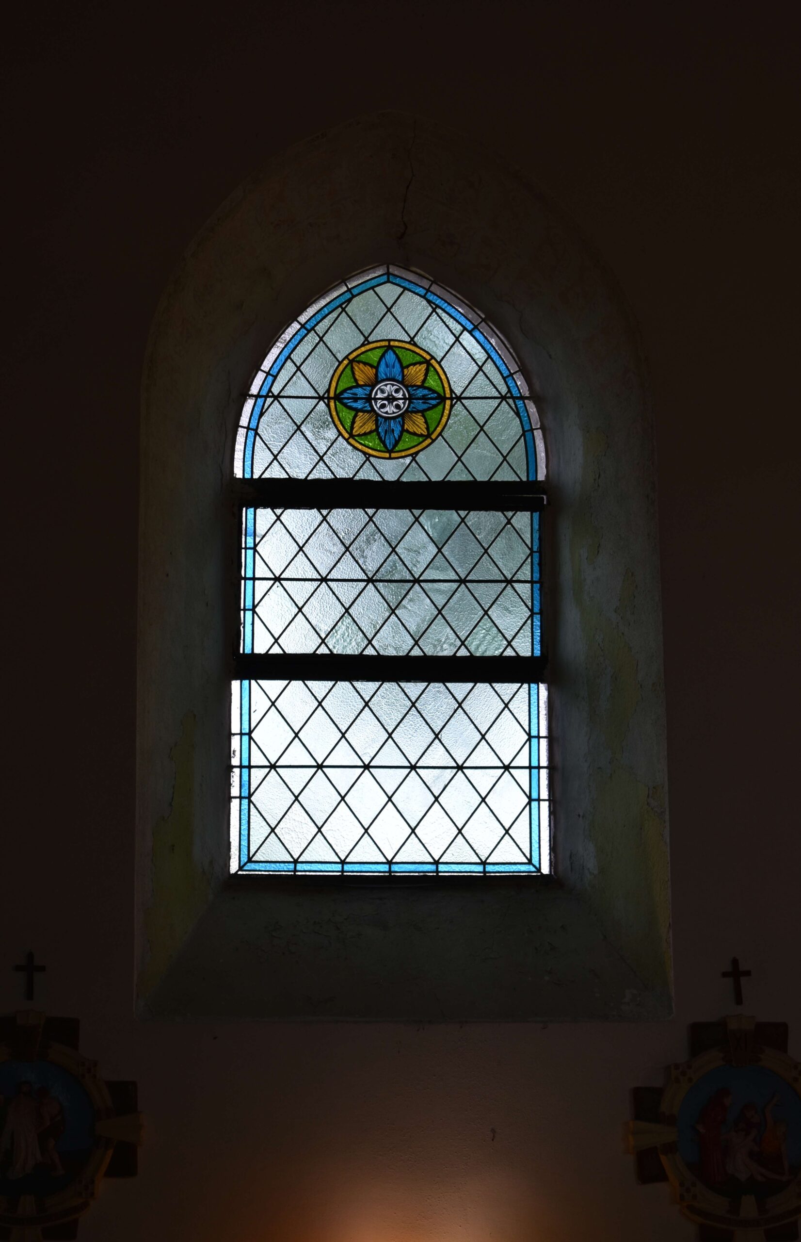 Witraż właściwy – numery 14, 15, 16 w prezbiterium oraz 1, 2, 3, 4 okna w nadświetlu oraz drzwiach wewnętrznych |