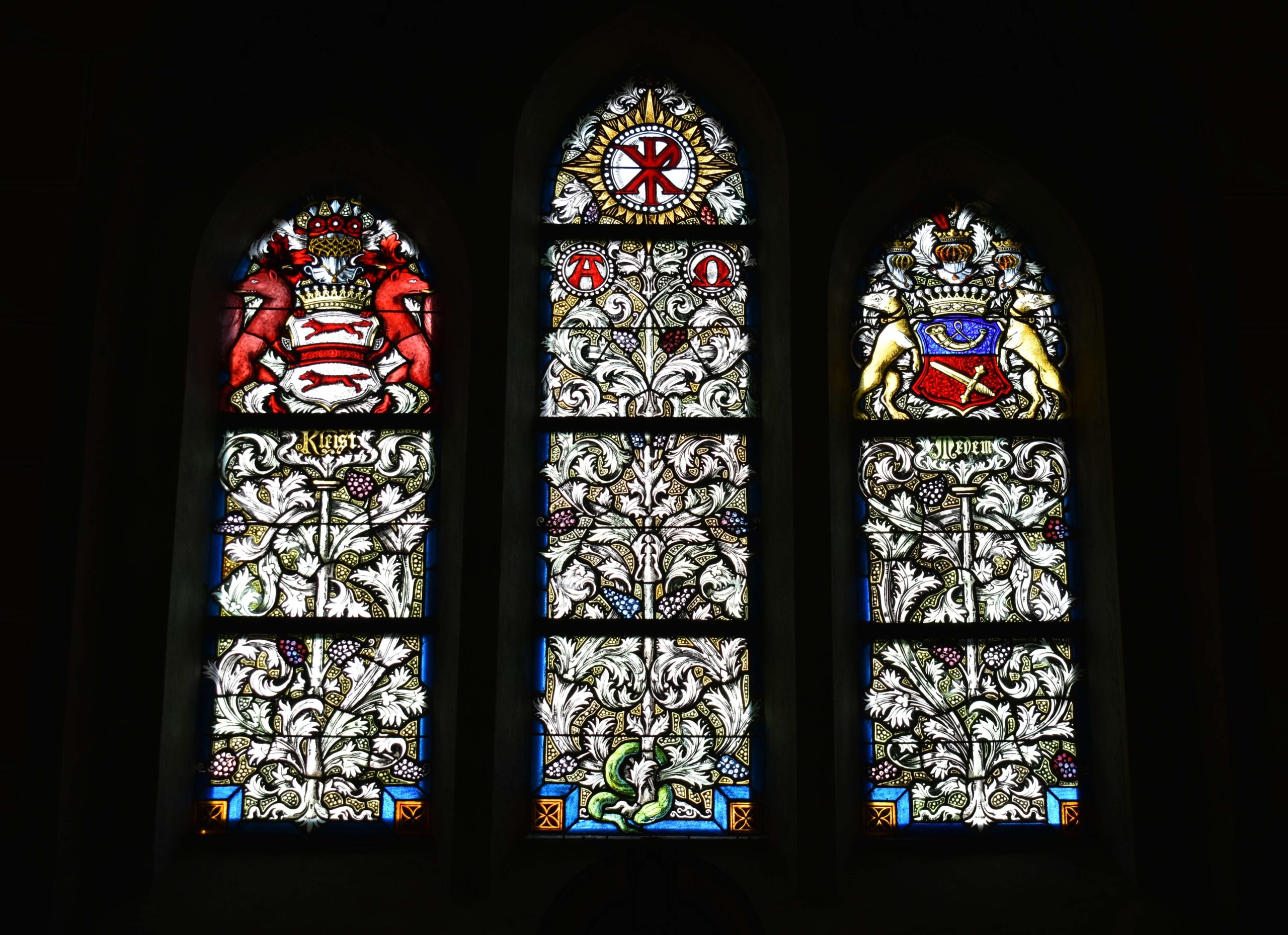 Centralne przedstawienie znajdujące się w prezbiterium, składa się z 3 okien o numerach: 14, 15, 16 tworzących triforium. Tematem wiodącym jest Drzewo Życia, na którego gałęziach umieszczono herby fundatorów i symbol Chrystusa. Witraż środkowy – 15 – zwieńczony jest symbolami chrystologicznym, a witraże 14 i 16 w górnej części wypełnione są herbami rodzin von Kleist i von Medem. Wokół i poniżej chrystogramu i herbów wiją się stylizowane liście akantu z kiściami winogron wyrastające z centralnego pnia. Elementy floralne utrzymane są w odcieniach szarości, jedynym akcentem kolorystycznym są fioletowe winogrona oraz żółte tło pomiędzy liśćmi. |